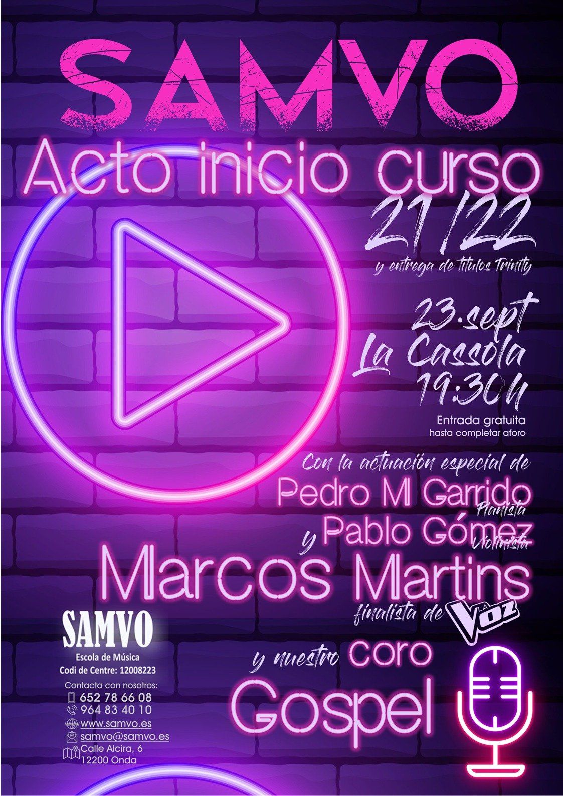 El passat cap de setmana va tindre lloc un inici de curs en la SAMVO amb música de primer nivell. Comencem el dijous 23 de setembre amb l'acte d'inici de curs en La Cassola A més d'entregar a l'alumnat graduat les certificacions oficials del Trinity College of London, com sempre en la SAMVO continuem posant un toc musical de qualitat amb actuacions dels professors de l'escola: Pablo Gómez al violí elèctric i Pedro Garrido al piano. Per a finalitzar l'acte el nostre nou director del cor *góspel –Marcos Martins– va interpretar amb una veu càlida i sensible un tema d'aquest estil musical i després va dirigir al nostre cor SAMVO Góspel Castelló Experience. El divendres 24 continuem amb el concert de l'orquestra dins del cicle d'intercanvis de la FSMCV. La nostra orquestra en la seua versió de corda ens va delectar amb un concert en primera persona amb un aforament més reduït. Com a colofó d'aquest inici de curs, el dissabte 25 i el diumenge 26 vam tindre l'honor de rebre a l'escola al gran cantant i actor Gerónimo Rauch, que va impartir una masterclass en la qual es van poder treballar els aspectes més importants de la veu i de l'actuació. L'acte va finalitzar amb l'emissió de l'audició final in streaming, donant així Rauch per finalitzada la seua masterclass amb la interpretació del tema «Salvalo» dels Miserables. La SAMVO seguirà amb noves classes magistrals i activitats durant aquestes setmanes, així com abans dels pròxims concerts i audicions. També continuarà amb les seues metodologies motivadores i adaptatives perquè es visca la música en color i alegria.