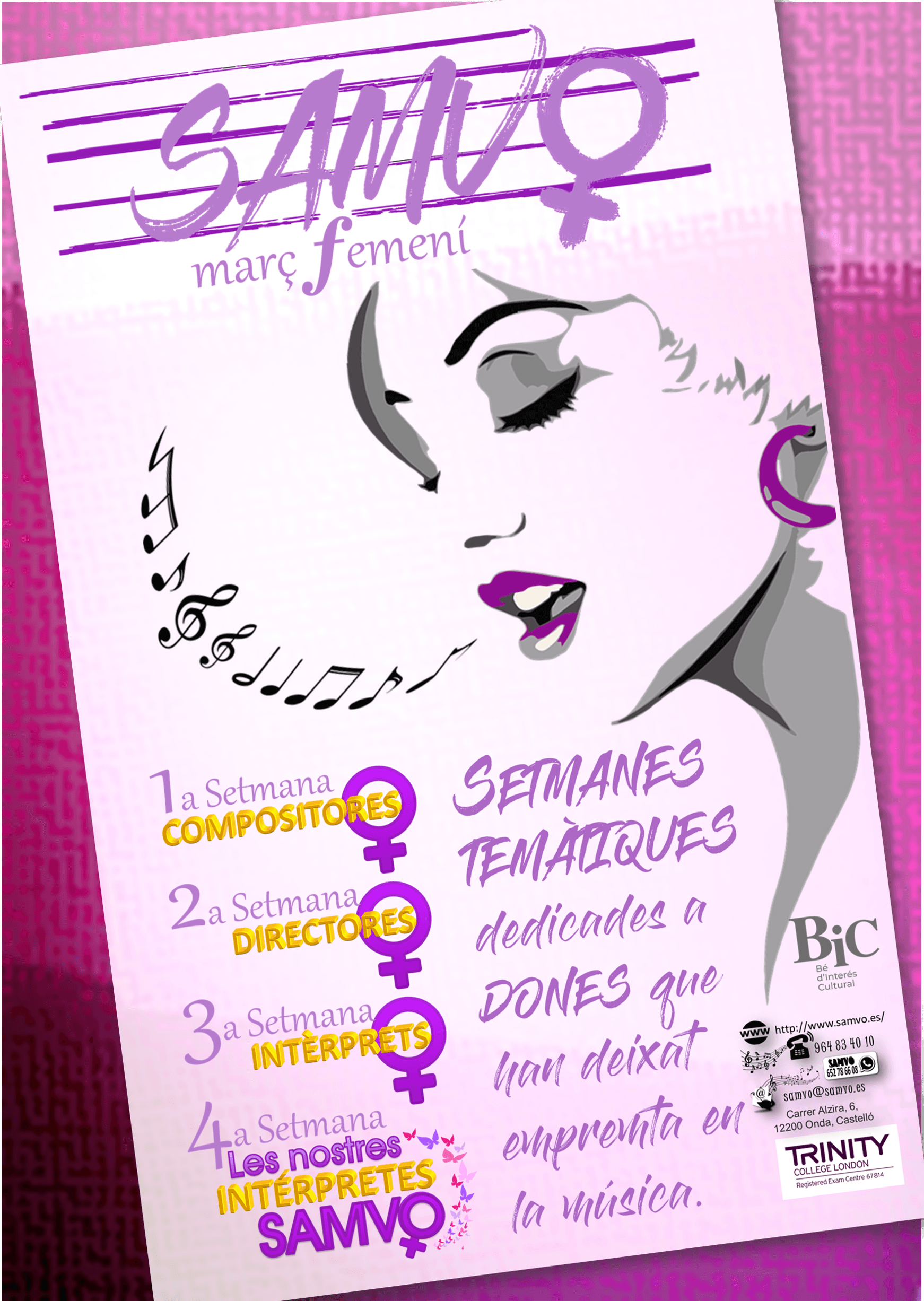 Durant el mes de març l'escola de música SAMVO realitzarà en les classes, fil musical i activitats un mes dedicat a les primeres compositores, directores i intèrprets de la història de la música. Amb açò, es vol donar en valor el paper de la dona en el món de la música on cada dia, ha de tindre més importància i notorietat. Estes grans dones, van lluitar per obrir camí en un món reservat únicament per a l'home. També farem l'última setmana de temàtica un reconeixement a les nostres pròpies intèrprets de la nostra escola. Per la igualtat i la visibilitat en la música.