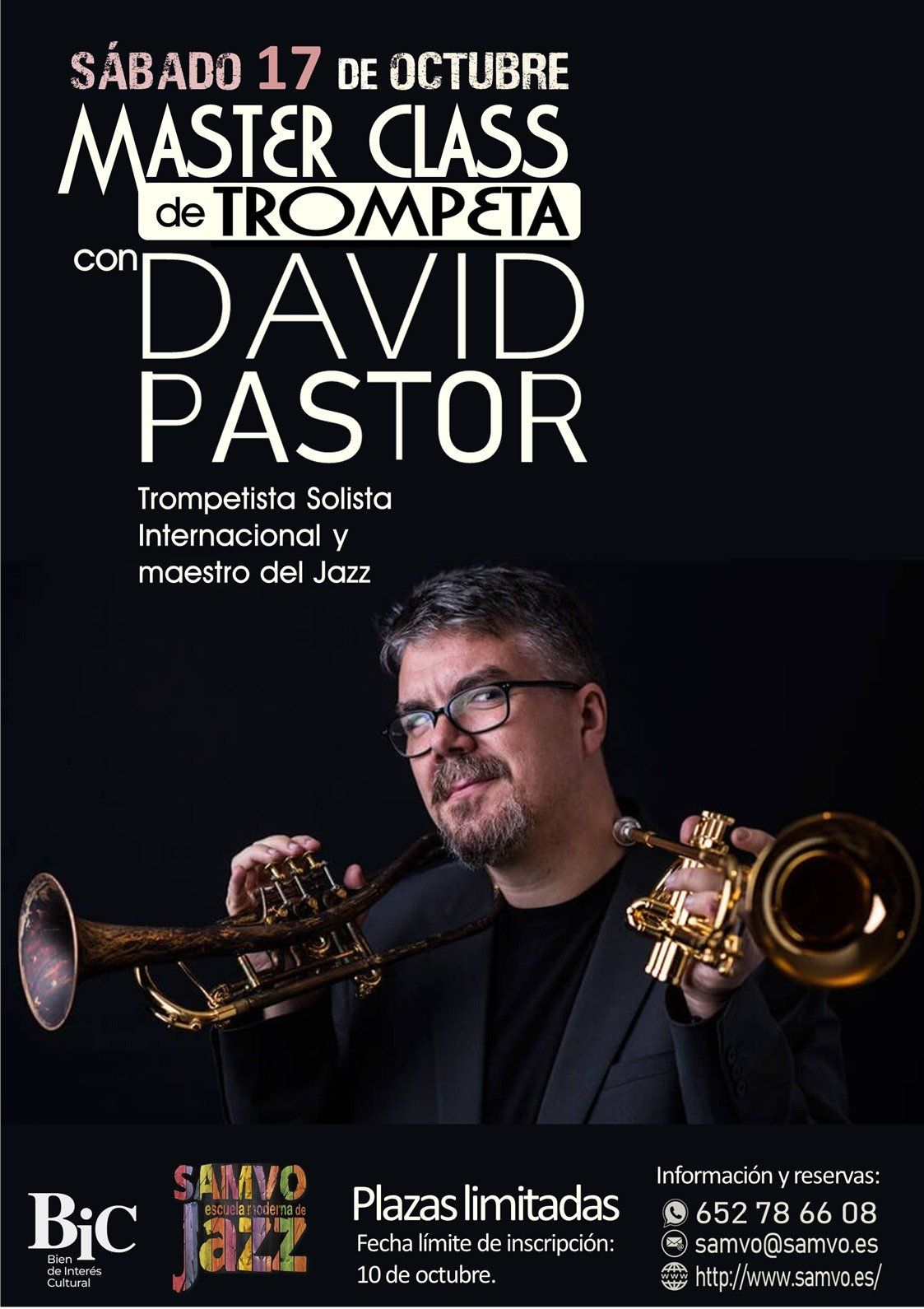 L’escola de jazz de la Samvo ha organitzat per al 17 d’octubre de 2020 una masterclass de trompeta presencial. Les classes seran impartides pel prestigiós trompetista solista internacional i gran mestre del jazz, David Pastor.
